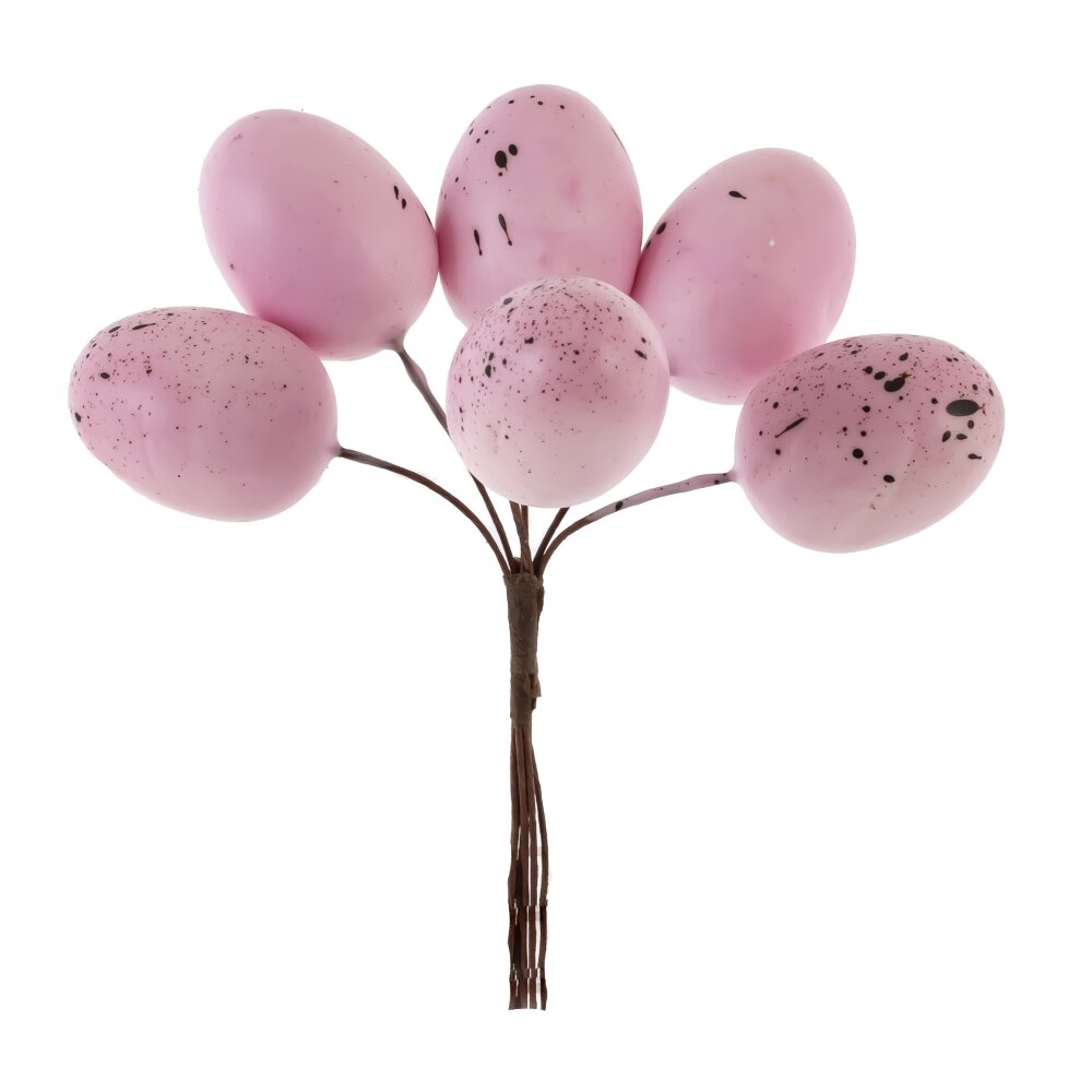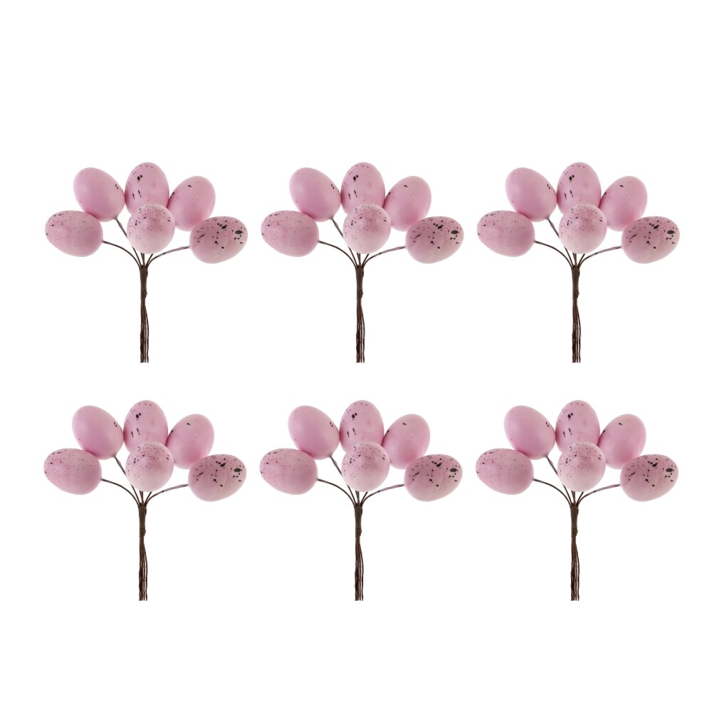 Набор из 6-ти декоративных букетов из пасхальных яиц - это стильный акцент для праздничного интерьера, который добавит праздничную атмосферу и уют в ваш дом. Каждое изделие представляет собой мини-букет из 6 небольших розовых яиц с крапинками, закреплённых на гибких металлических ножках. Композиции удобно вставлять в корзины, пасхальные композиции, флористические букеты, венки и декоративные горшки. Лёгкие и износостойкие полимерные материалы сохраняют форму и цвет, не боятся случайных падений и подходят для многократного использования из года в год. Такой набор поможет быстро создать атмосферу весеннего праздника дома, в офисе, витрине магазина или детском саду. Декоративные пасхальные яйца можно расположить на праздничном столе в виде композиции, а также такие яйца станут прекрасным подарком для близких и друзей в светлый праздник Пасхи. Пасхальная композиция это милый и запоминающийся подарок на день рождение или 8 марта.