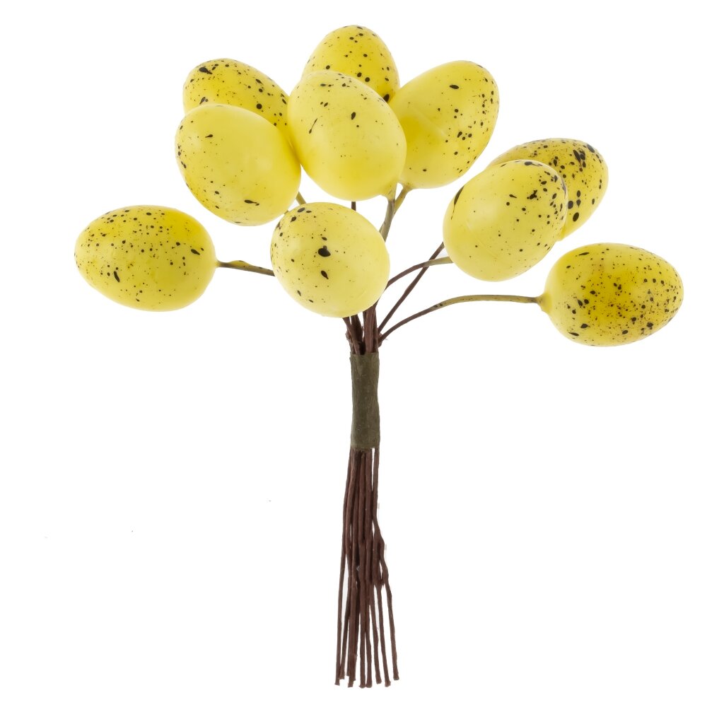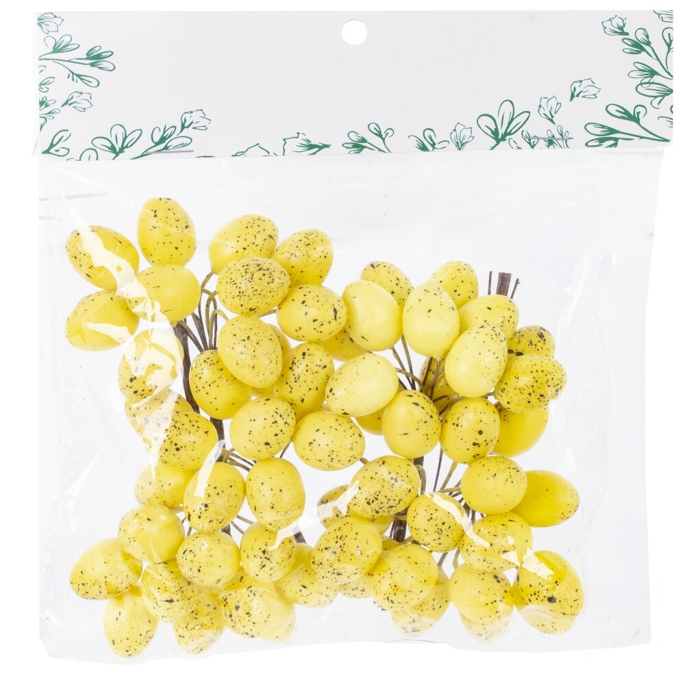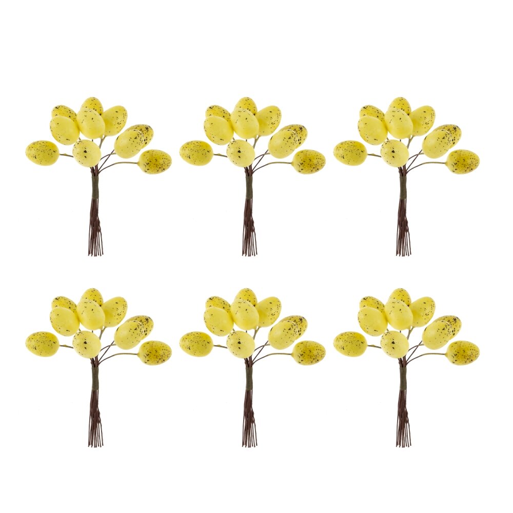 Набор из 6-ти декоративных букетов из пасхальных яиц - это стильный акцент для праздничного интерьера, который добавит праздничную атмосферу и уют в ваш дом. Каждое изделие представляет собой мини-букет из 10 небольших жёлтых яиц с крапинками, закреплённых на гибких металлических ножках. Композиции удобно вставлять в корзины, пасхальные композиции, флористические букеты, венки и декоративные горшки. Лёгкие и износостойкие полимерные материалы сохраняют форму и цвет, не боятся случайных падений и подходят для многократного использования из года в год. Такой набор поможет быстро создать атмосферу весеннего праздника дома, в офисе, витрине магазина или детском саду. Декоративные пасхальные яйца можно расположить на праздничном столе в виде композиции, а также такие яйца станут прекрасным подарком для близких и друзей в светлый праздник Пасхи. Пасхальная композиция это милый и запоминающийся подарок на день рождение или 8 марта.